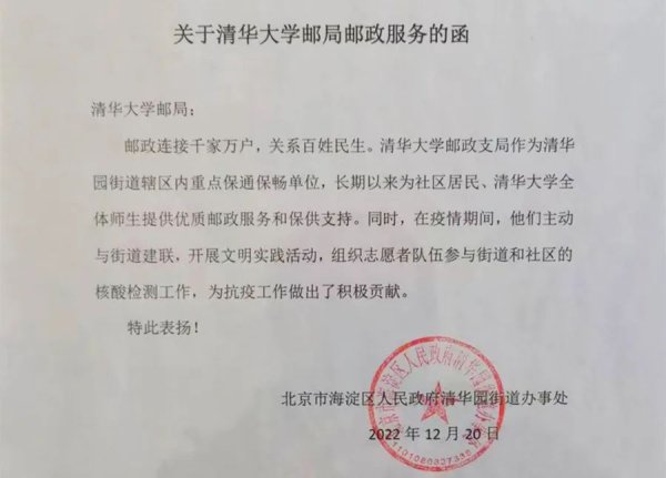 為此,清華園街道特發來表揚函,函中寫道,郵政連接千家萬戶,關系百姓民生,清華大學郵政支局作為清華園街道轄區內重點保通保暢單位,長期以來為社區居民、清華大學全體師生提供優質郵政服務和保供支持;同時,疫情期間主動與街道建聯,組織志愿者參與街道和社區核酸檢測工作,為抗疫工作作出積極貢獻。