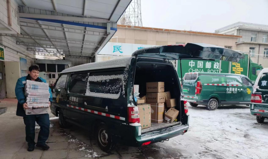 在康莊支局,投遞員將包裹遞給用戶(hù)并說(shuō)道:“能及時(shí)把包裹送到您的手中是我們雪天投遞的最大心愿。”