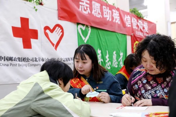 3月3日上午,北京郵區中心志愿服務隊來到朝陽區和平街街道溫馨家園,這里是殘疾人康復中心,也是殘疾人活動中心,服務對象為患有精神殘疾和智力殘疾的殘疾人。郵區中心《志愿助殘 信使傳愛》項目已在這里服務了10年,疫情過后的再次團聚讓志愿者和殘疾人朋友們歡喜萬分,激動不已。這次,志愿者帶來了殘疾人喜愛的明信片,引導并幫助他們在明信片上寫下祝福和愿望。活動中,志愿者傾聽殘疾人朋友對祖國的祝福,對全國兩會的期許,對美好生活的向往和心底的訴求,并做了心理疏導,這是殘疾人康復訓練的一部分;志愿者根據殘疾人朋友書寫能力的不同,以“寫”和“畫”相結合的方式,悉心指導他們完成明信片寄語的書寫。一張張明信片,承載了殘疾人們滿滿的希望,上面寫著“希望兩會代表來看我們”“賀兩會召開”“愿兩會給殘疾人帶來更多美好”“兩會召開,喜訊傳來”等等美好寄語。