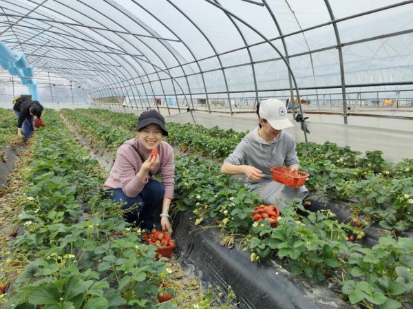 動結合郵政惠農活動,特意選在南陵縣黃墓村黨組織領辦合作社的草莓大棚舉行。3月8日下午1點,郵政巾幗們準時出發,踏上快樂采摘之旅。一踏入草莓大棚,清新的草莓果香撲鼻而來,一派清新的田園氣息,放眼望去,鮮紅欲滴的草莓果實在一壟壟碧綠的草莓秧中若隱若現,紅綠交映,一片生機勃勃。大家手提小果籃,沿著整齊的草莓田,化身快樂的小果農,一邊采摘品嘗,一邊相互交流,氣氛輕松活潑,體驗著采摘草莓、品嘗鮮果的樂趣,現場快樂與熱情四溢。經過一個多小時的采摘后,大家都有了豐碩的成果,每個人的臉上充滿著幸福的笑容和活力。