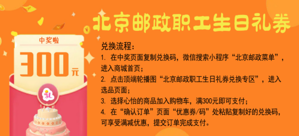 活動時間為2023年4月1日至2024年3月31日。2023年北京郵政職工生日祝福活動由三個環(huán)節(jié)組成: 一是手機短信送祝福,在北京郵政職工生日當天,商函中心將根據(jù)職工的有關(guān)信息,通過發(fā)送手機短信的方式送出祝福信及生日賀卡,并提示職工掃描賀卡中“郵會通”二維碼進入“郵會通”微信公眾號。二是“郵會通”公眾號送驚喜,職工進入“郵會通”微信公眾號后,打開“我愛我家”中的“生日祝福”專區(qū),進入到“生日大抽獎”界面,點擊“抽獎”,將有機會抽取到30元-300元五個獎項的生日禮券,同時還會得到相對應(yīng)的禮券兌換碼。 三是“北京郵政菜單”送福利,職工在中獎頁面復制兌換碼,微信搜索小程序“北京郵政菜單”,進入商城首頁,然后進行果疏生鮮、肉蛋副食、米面糧油、包裝食品、家居日化及飲料乳品等物品兌換。