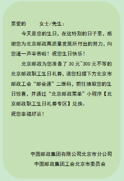 為全面貫徹落實市分公司2023年為職工辦實事項目——“提升職工士氣,努力增強職工獲得感,市分公司為全體職工送上個性化生日祝福,各基層單位以部門工會為主體為職工過集體生日”,2023年,北京郵政工會擬在去年開展職工生日祝福活動的基礎(chǔ)上,加強專業(yè)協(xié)同,充分利用商函中心、發(fā)行中心和渠道部的專業(yè)優(yōu)勢和資源,通過“手機短信、郵會通及北京郵政菜單”三個平臺,開展郵政職工“送祝福、送驚喜、送福利”三連送活動,以個性化的服務(wù)為職工謀幸福,為企業(yè)謀發(fā)展助力。