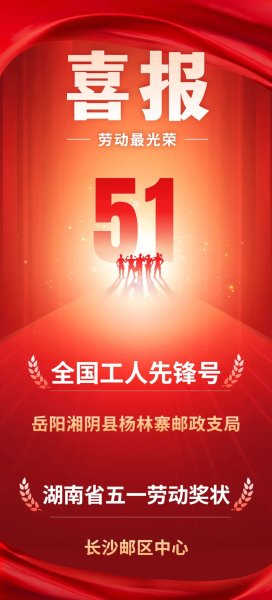 近日,岳陽湘陰縣楊林寨郵政支局被中華全國總工會授予“全國工人先鋒號”榮譽稱號。長沙郵區(qū)中心被湖南省總工會授予“湖南省五一勞動獎狀”榮譽稱號。