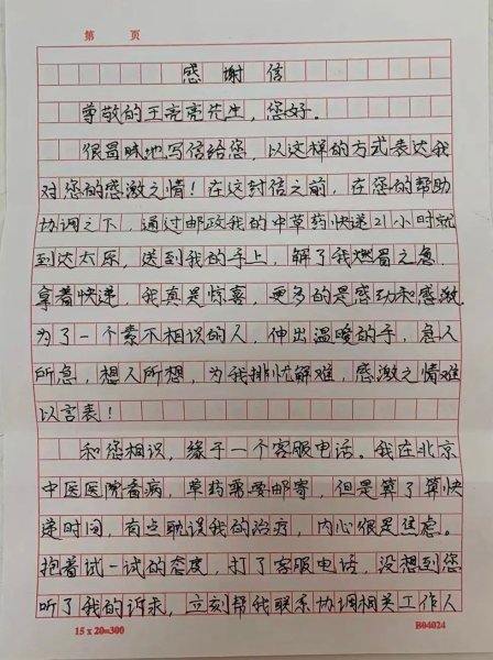 近日,一封由山西省太原市寄出的感謝信送到同城業務分公司南區集散客服王亮亮手中。 用戶洪女士飽含深情地感謝在王亮亮的協調幫助下,自己21小時就收到來自北京的草藥郵件,解了燃眉之急。