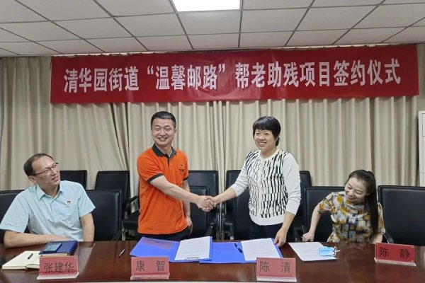 5月25日,海淀區分公司清華大學郵政支局與清華園街道殘聯共同簽署了“溫馨郵路”合作協議,清華園街道黨工委書記、街道辦事處主任許立冬,辦事處副主任方仲奇,清華園街道殘聯理事長陳清,清華大學郵政支局局長張建華,快遞員代表康智等,共同參加簽約儀式。