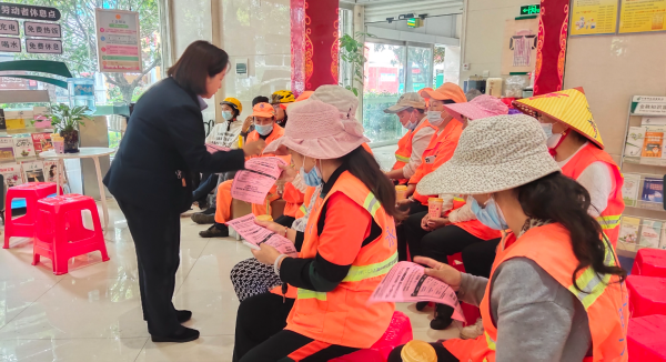 戶外勞動者服務站建在吉慶路營業所大廳內,為大家準備了飲水機、手機充電器、免費讀物、微波爐、急救包、雨傘等,日常需要的東西在這里基本都有,像一個溫暖的家。工會主席高建彩熱情地給大家介紹了站里的物品都無償提供給大家使用,贏得了大家的一片喝彩。吉慶路營業所理財經理劉楊還給大家上了一場防詐騙微課堂,提醒大家接到異常電話一定要來咨詢她,子女在外,有需要幫助的也來找她,之后還給大家發放了帽子、手套等小禮品。