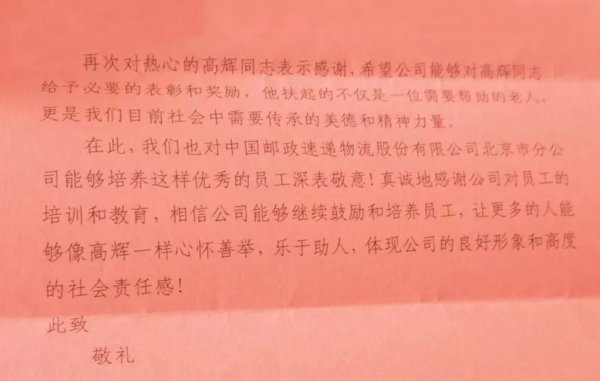 不久之后,高輝就得知李女士寫了一封感謝信并郵寄到北京市郵政分公司,感謝他的同時,高度贊揚了郵政人高尚的道德情操以及社會責任感。“收到感謝信,我很意外、也很欣慰。”高輝說,自己只是做了一件小事,卻收獲了這份意外的感動。
