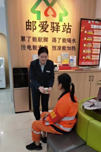 戶外勞動者服務站幫助了廣大戶外勞動者解決長期面臨的“吃飯難、喝水難、休息難”等各種現實問題,充分調動他們的工作積極性,提升了他們的歸屬感、幸福感,“郵愛驛站”,用行動傳遞溫暖。