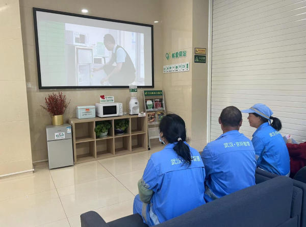 水果湖郵愛驛站設(shè)置在網(wǎng)點(diǎn)的一角,戶外工作者時(shí)常會(huì)來歇歇腳,小憩一下,補(bǔ)充點(diǎn)水分。為豐富服務(wù)內(nèi)容,每天網(wǎng)點(diǎn)電視會(huì)滾動(dòng)播放防詐騙視頻、郵愛驛站宣傳片、勞模宣傳片等,讓戶外工作者在給身體“充電”的同時(shí),也能通過觀影,給精神世界“充電”。