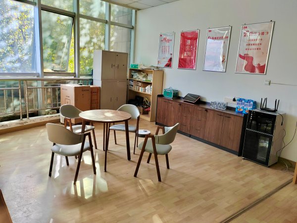 休息區:配備了簡約風格的圓桌及休閑椅,供職工業余休閑交流;同時采購了兩把可拉伸沙發,拉伸后作為躺椅,提升放松舒適度。