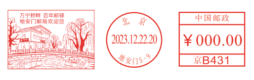 今年是地安門郵局遷入現址20周年,12月22日-31日開展遷址重張20周年紀念活動,正式啟用“萬寧橋畔 百年郵驛 地安門郵局歡迎您”郵資機宣傳戳。該宣傳戳以萬寧橋與地安門郵局房屋建筑為主要圖案,將門前楊柳、橋下鎮水獸、河中盛開的荷花等細節一一展現,突出地安門郵局地域特點和歷史文化積淀。同時,配套印制同圖紀念封一枚。