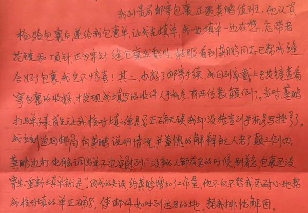 那天,用戶隋阿姨到網點郵寄包裹,物品零碎且重量較沉,龔金鵬一邊指導隋阿姨填寫好單據,一邊快速完成了包裹檢驗和封裝工作。再次核對完郵寄信息后,龔金鵬將單據交到隋阿姨手中,叮囑其妥善保管。業務辦理完沒過多久,隋阿姨又從回家途中折返回網點,原來是她沒有戴花鏡,把電話號碼填錯了,剛才核對時也沒看出來,回家路上才發現。看到隋阿姨焦急的表情,龔金鵬一直耐心安慰。“阿姨,您別急!包裹還沒寄出,郵寄信息我很快就能幫您改好。”修改完信息后,龔金鵬又與隋阿姨認真核對了一遍,服務中的種種細節,讓隋阿姨覺得既親切又溫暖。于是,她寫下感謝信,親自送到網點負責人手中,表達自己的感謝之情。