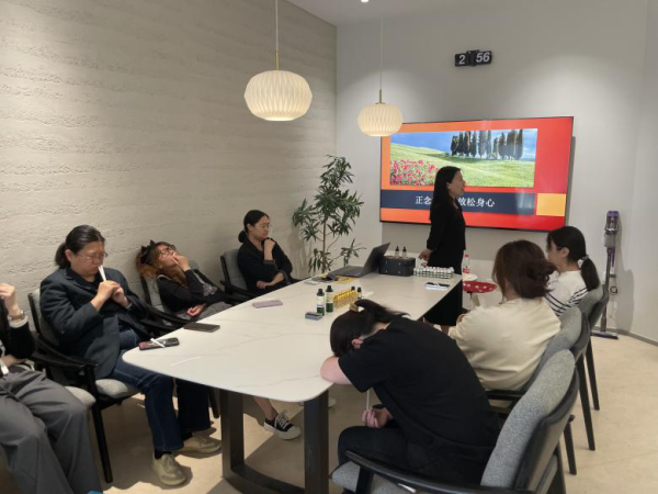 活動開場,國家二級心理咨詢師、芳香治療師張鳴老師先讓大家觀察圖片進行情緒自測,測試大家最近的心理和情緒狀態(tài),進而讓大家了解到情緒的起伏會引發(fā)不同程度的心身疾病。課堂上張鳴老師分別介紹各種精油的使用方法、功能療法和注意事項。 在正念冥想環(huán)節(jié),老師讓大家保持安靜,放松身心,“慢慢找到最放松的呼吸節(jié)奏”、“感覺喜歡的香氣正在漸漸地進入你的身體”、“越來越放松”、“臉部肌肉越來越輕柔、光滑”、“眉毛向兩側輕輕地劃開”等等,讓大家跟隨聲音沉浸式體驗其中,以達到感官復蘇、呼吸重塑、減輕壓力、改善心理癥狀和提升幸福感的作用。