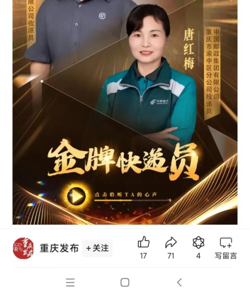 5月9日,由渝中區委宣傳部、渝中區委網信辦、渝中區文明辦、渝中區新時代文明實踐指導中心主辦,人民網重慶頻道承辦的2024年“渝中文明之星”評選中,渝中郵政攬投員唐紅梅獲得2024年“渝中文明之星——金牌快遞員”榮譽稱號。