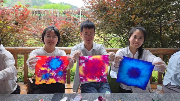 通過小游戲環節,大家的團隊協作意識進一步增強。“舞龍”環節是用氣球編織龍身,各個小組完成舞龍規定動作。現場4支隊伍你追我趕,互相競爭,大家表演各種“自創動作”,翻江倒海、雙龍戲珠......現場一片熱鬧景象;小游戲“賣西瓜”環節考驗隊員的反映速度及團隊意識,通過不同隊員自由組合達到目標。學習“扎染”環節,大家首先跟隨老師了解了扎染的歷史和工藝,隨后大家自己動手制作,不多時,一條條色彩斑斕的手帕便紛紛出現在大家面前。