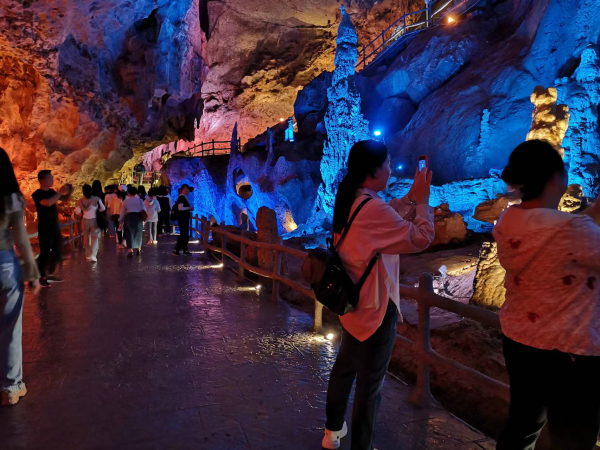4月26日,60余名職工乘車前往陽新縣,第一站來到百洞峽景區。穿過夢幻的“時光隧道”,便進入百洞峽主洞“山海幻境”一號廳了,身處猶如天然客廳的巨大石洞,大家紛紛驚嘆不已,向右走乘坐電梯,繼續游覽,沿路布滿形態各異的石筍、石幔、石柱等鐘乳石景群,洞內天橋、石林、懸崖、絕壁、水潭、玻璃觀景平臺,氣勢恢宏,令人震撼。