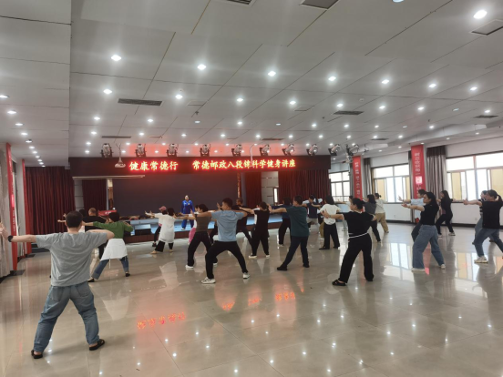 講座分為如何進行科學健身知識講座和八段錦現場教學兩個階段,現場還請來了兩位肩頸專家進行咨詢義診,吸引了眾多肩頸腰椎不適的員工紛紛現場咨詢就診。講座現場,大家都聽得仔細認真、不時就自己關心的健身問題向專家提問請教;八段錦學習現場,老師在臺上用心地教,大家在臺下全身心投入地學習:一招一式、一呼一吸都學得那么認真,老師還不時下來對大家進行指導糾正,一套動作打下來,全身炙熱通透,酣暢淋漓,輕松愉快。