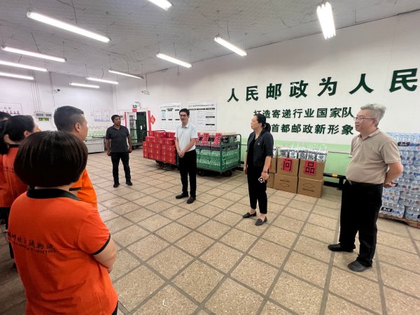 6月27日下午北京市郵政工會王賀利主席、薛筠副主席,來到同城業務分公司進行暑期慰問,并為投遞員們帶來了市公司工會的防暑降溫包。
