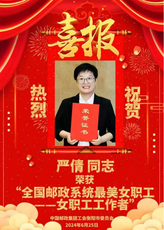 6月25日召開的中國郵政集團工會女職工委員會三屆一次全委(擴大)會議,授予32名女職工工作者“全國郵政系統最美女職工工作者”榮譽稱號,衡陽市郵政分公司女工委主任嚴倩榜上有名,為湖南郵政系統唯一獲此榮譽的女職工工作者。