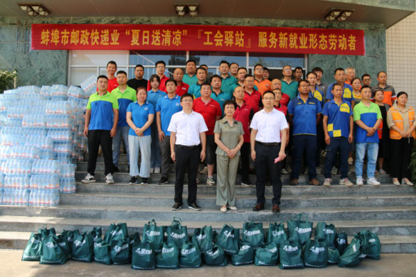 7月31日上午,蚌埠市總工會、市郵政管理局領導一行來到市郵政分公司開展“夏日送清涼”慰問“工會驛站”和新就業形態勞動者活動。