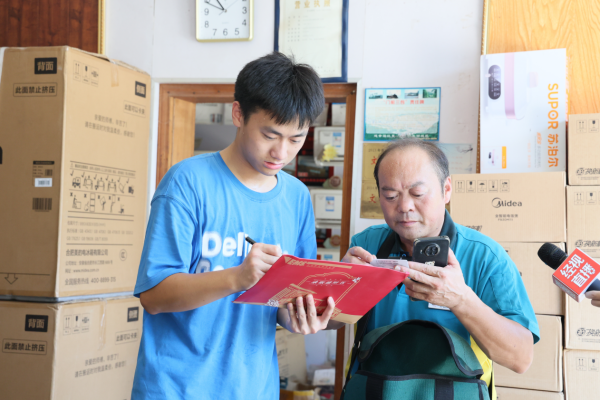 “快把準(zhǔn)考證和身份證拿出來(lái)!”在簽收規(guī)則面前,父子倆也得“見(jiàn)外”。經(jīng)過(guò)嚴(yán)格查驗(yàn)有效證件、規(guī)范簽收后,熊桂林親手將錄取通知書(shū)鄭重地遞交到兒子的手中。與此同時(shí),江夏區(qū)郵政分公司為熊桂林一家送上了祝福鮮花和“送喜專(zhuān)家”舉家歡慶大禮包。