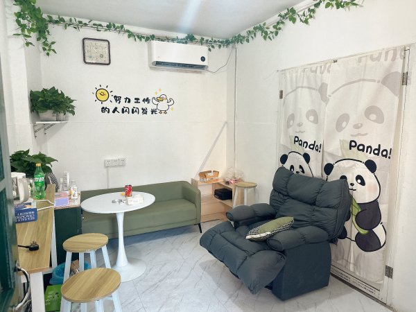 細致規劃精心選址,建設清新的“安樂小屋”。郊區局所雖然局房面積較大,但大多與生產場地非同一樓層,無法高效利用,員工體驗度不高的問題普遍存在。經過多次實地走訪調研,最終選定廟鎮支局緊臨支局主樓北側,連接于投遞操作間西側,原兩間物料間,其中具有采光通風條件的“外間”作為休息室,里間用于放置冰箱等物品,面積雖然只有10㎡,但與生產場地僅一墻之隔,自帶的區位優勢很好的滿足了休息室“方位近”的建設標準,非常方便職工利用碎片時間休憩放松。休息室整體為“白綠”小清新格調,“郵政綠”的沙發、綠色的半透光玻璃木門、綠色的植物、用于遮擋空調管線的塑料綠色藤蔓,可愛的熊貓竹子裝飾門簾,原木色的小書柜,充滿正能量的標語貼。。。通過大家的精心裝置,小屋營造出了一種寧靜溫馨,鮮活怡人的氛圍,讓職工在忙碌的工作之能夠享受到媲美家的安樂與舒心。