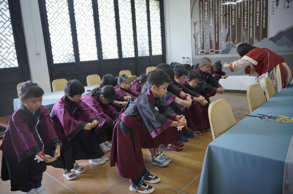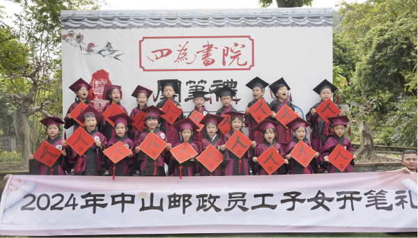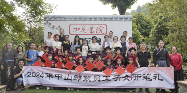 8月24日上午,晨光初照,19位即將入讀小學(xué)一年級(jí)的員工子女身穿傳統(tǒng)服飾,在父母的陪伴下,踏入古色古香的中山詹園孝道館,參加中山市郵政工會(huì)組織的“開(kāi)筆禮”活動(dòng)。