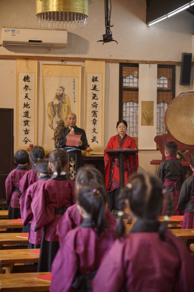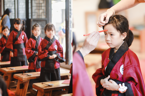 活動(dòng)現(xiàn)場(chǎng),孩子們?cè)谒径Y的引導(dǎo)下,逐一體驗(yàn)了正衣冠、拜師禮、朱砂啟智、擊鼓鳴志、啟蒙描紅等傳統(tǒng)儀式。這不僅讓孩子們感受到了中華文化的博大精深,更在他們幼小的心靈中種下了尊師重道、勤奮好學(xué)的種子。而當(dāng)孩子們?cè)诶蠋煹闹笇?dǎo)下,鄭重其事地書寫下人生第一個(gè)“人”字時(shí),則寓意著立身行己,啟迪孩子們不要忘記學(xué)習(xí)的根本是要做一個(gè)大寫的“人”。