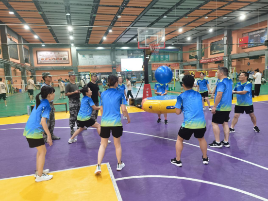 比賽正式開始,參賽選手都拿出了看家本領。在氣排球賽場上,隊員們猛烈的扣球攻擊、巧妙的雙手接球,互為攻守,精彩連連,讓現場的觀眾喝彩聲不斷;在趣味運動賽場上,隊友們在歡聲笑語中團結協作,揮灑汗水,奮力拼搏,旁邊拉拉隊加油聲此起彼伏;裁判員和工作人員各司其職,保證了各項比賽正常進行……。