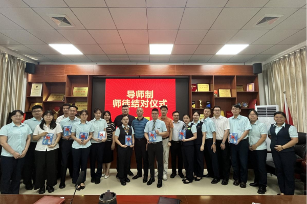 封開縣分公司則組織了一場簡潔而又不失隆重的導師制師徒結對儀式。在全體與會員工的見證下,縣分公司總經理陳石堅、副總經理盧彥芳首先與各自的徒弟完成結對,隨后其他4對師徒行結對拜師禮。這一儀式不僅加深了師徒之間的情感紐帶,更讓雙方明確了自己的責任與使命,將儀式的莊重感轉化為推動工作的責任感,營造了濃厚的“傳、幫、帶”工作氛圍。
