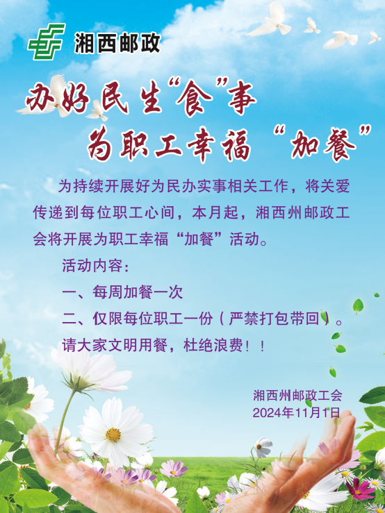 關愛員工是企業文化建設的基礎,為職工幸福“加餐”是關愛員工的重要舉措。下一步,湘西州郵政工會將持續開展為職“加餐”活動,在優化服務上下功夫、在滿意度上求實效、讓職工幸福感成色更足。