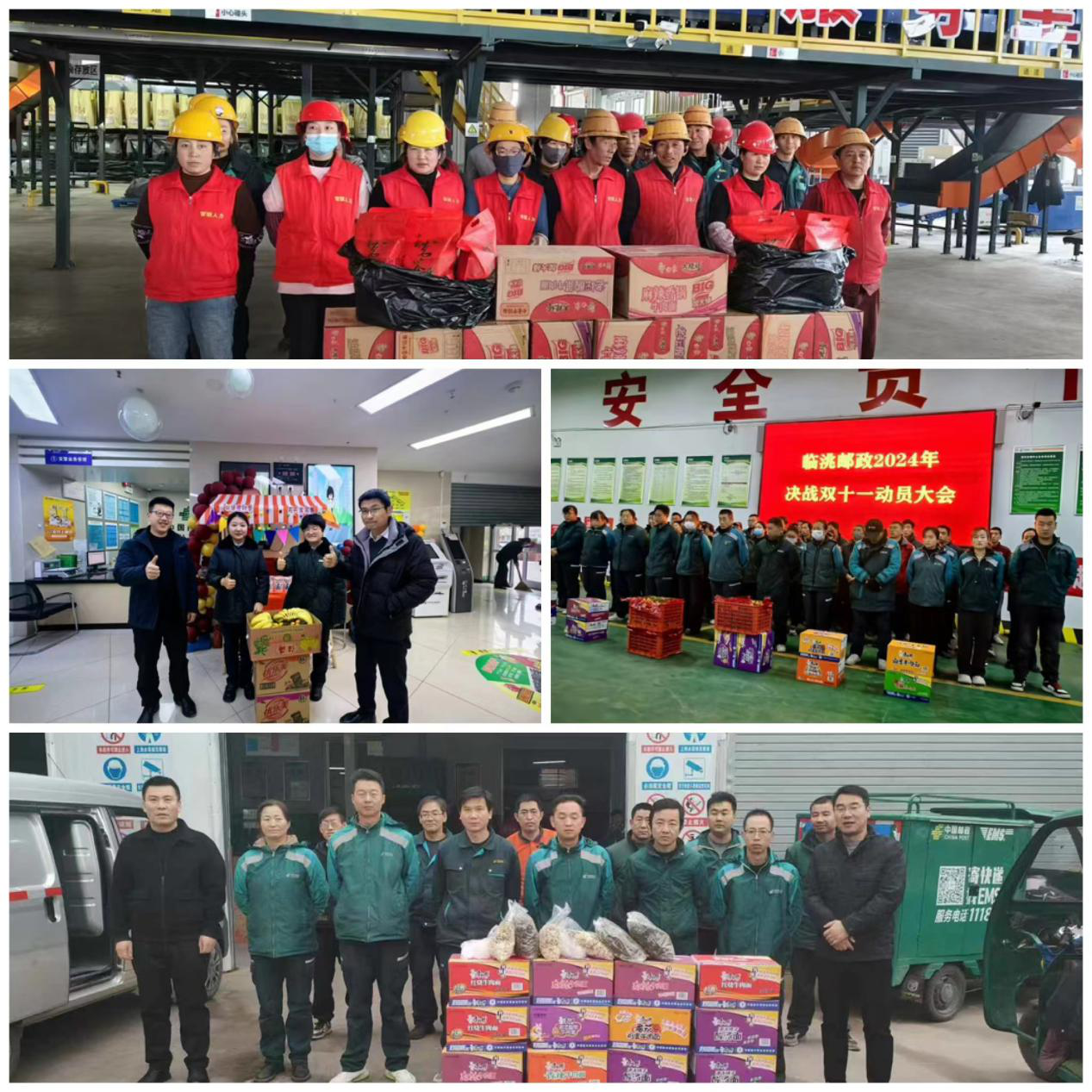 市縣各級(jí)工會(huì)準(zhǔn)備了茶葉、冰糖、大棗、方便面等物資前往郵件處理中心及攬投部等一線生產(chǎn)場(chǎng)地,為一線員工送去了關(guān)懷和溫暖。每到一處,市縣各級(jí)領(lǐng)導(dǎo)與員工親切交談,詳細(xì)了解他們的生活、住宿和工作用餐條件,關(guān)心他們的工作和生活狀態(tài),為他們解決生活上、工作中的困難,對(duì)他們?cè)诤鞖庀虏晃菲D辛、守崗敬業(yè)的精神給予高度贊揚(yáng)。并強(qiáng)調(diào)打贏“雙11”是中國郵政踐行“國家隊(duì)”使命擔(dān)當(dāng)?shù)谋厝灰螅骷?jí)人員要強(qiáng)化領(lǐng)導(dǎo),精心組織,圍繞“強(qiáng)能力、提規(guī)模,強(qiáng)營銷、提份額,強(qiáng)運(yùn)營、提時(shí)限,強(qiáng)服務(wù)、提形象”的“四強(qiáng)四提”目標(biāo),以“兩大靶向法”為抓手,通過落實(shí)優(yōu)化時(shí)限標(biāo)準(zhǔn)、狠抓過程管控、提升郵件時(shí)限、提升運(yùn)營能力來確保全網(wǎng)暢通;各級(jí)人員要強(qiáng)化客服保障,優(yōu)化客戶體驗(yàn),壓實(shí)主體責(zé)任,確保安全生產(chǎn),全力以赴打好“雙11”戰(zhàn)役。