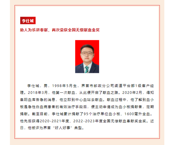 經推薦、審核、投票、評議等程序,阜陽郵政李仕城獲評助人為樂類第四季度“阜陽好人”。 2018年3月,李仕城第一次獻血,從此便開啟了獻血之路。2020年2月,得知阜陽血庫告急的消息,他立即到中心血站去獻血。獻血過程中,他了解到血小板是急性白血病患者的有效治療手段后,便主動申請成為血小板捐獻者,定期捐獻。截至目前,李仕城累計捐獻了95個治療單位血小板、1600毫升全血。他先后獲得2020-2021年度、2022-2023年度全國無償獻血奉獻獎金獎。