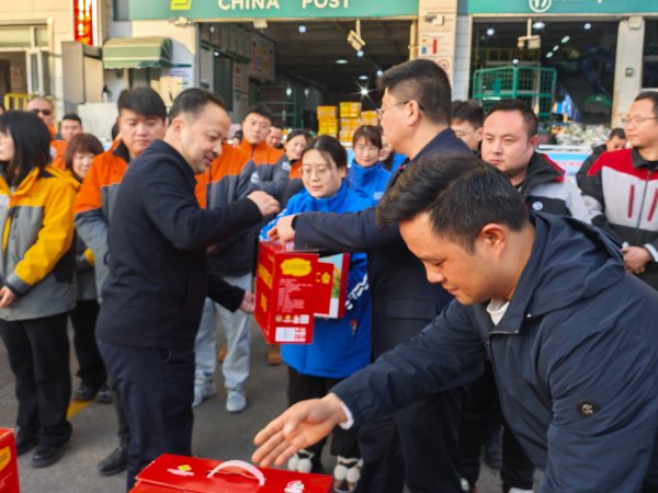 省國防工會靳海斌副主席發表了真摯且充滿力量的講話。他著重強調,快遞行業的作用愈發凸顯,從業者們頂風冒寒,全力保障物流通暢,為社會運轉和經濟發展作出了重要貢獻。他鼓勵大家在未來的工作中繼續保持這份熱情與干勁,勇往直前,向快遞從業者們致以深深的敬意與衷心的感謝,慰問團還為快遞從業者代表發放了慰問品。