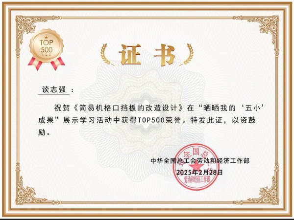 中華全國總工會2月18日頒發(fā)證書:祝賀江蘇郵政報送的《簡易機格口擋板的改造設(shè)計》創(chuàng)新項目被成功收錄于2024年度全國職工“五小”創(chuàng)新成果庫并入圍“職工之家”APP展示。該創(chuàng)新項目在中華全國總工會組織開展的“曬曬我的‘五小’成果”展示學習活動中獲得T0P500榮譽。