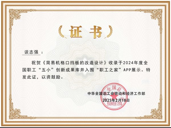 2024年4月,集團工會按照中華全國總工會數(shù)智化建設(shè)工作和工會助力職工創(chuàng)新創(chuàng)造智能化輔助系統(tǒng)“工會助創(chuàng)云”的建設(shè)要求,組織開展了全國郵政職工“五小”創(chuàng)新成果征集活動。江蘇省郵政工會組織報送的南京郵區(qū)中心《簡易機格口擋板的改造設(shè)計》創(chuàng)新項目最終被成功收錄于2024年度全國職工“五小”創(chuàng)新成果庫。