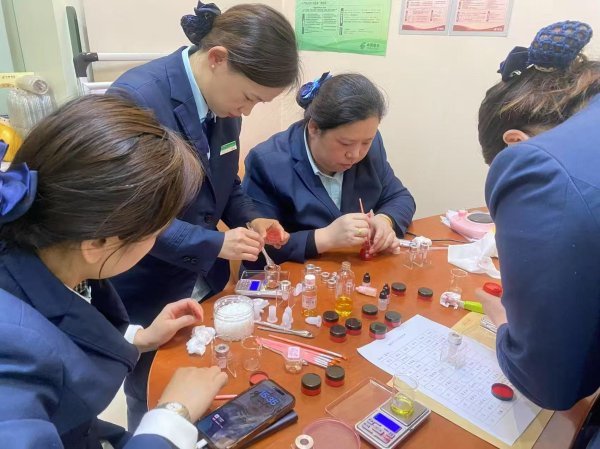 楊行支局的女職工們全神貫注,沉浸在親手制作口紅的樂趣中。色彩斑斕的原料整齊排列,從稱量色粉到精準調色,當一支支獨一無二的口紅在手中誕生,成就感油然而生。