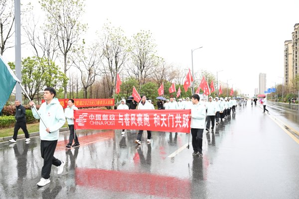 3月28日,2025年天門市春季萬人8公里健康跑在竟陵街道黨工委北湖大道如期開跑。天門市郵政分公司跑團50名隊員身著統(tǒng)一服裝,手擎中國郵政大旗與企業(yè)文化方塊旗和“與春風賽跑、和天門共躍”的健康跑活動主題橫幅,在綿綿春雨中邁著歡快矯健的步伐,用腳步丈量城市,用汗水澆灌健康,在運動健身的同時盡享北湖美景,成為活動現(xiàn)場靚麗的流動綠色風景線。