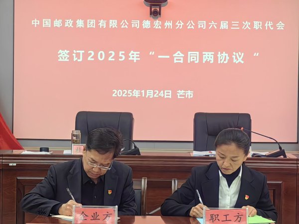 大會總結2024年工作,部署2025年任務,會議聽取了州分公司黨委書記、總經理杜國祥所作的題為“攻堅克難勇擔當增強能力提質效持續推動德宏郵政高質量發展”的行政工作報告和州郵政工會主席段春燕作的題為“夯基礎 強服務勇擔當 凝心聚力為德宏郵政高質量發展貢獻力量”的工會工作報告。大會通過了職代會四個專門委員會的工作報告和2024年“一合同兩協議”履行情況報告,以及工代會的工會財務、女工委、經審工作報告,職工代表對州分公司領導班子及成員進行了民主評議,企業與工會簽訂了2025年《中國郵政集團有限公司德宏州分公司集體合同》《中國郵政集團有限公司德宏州分公司工資集體協商專項協議》《中國郵政集團有限公司德宏州分公司女職工特殊保護專項協議》。