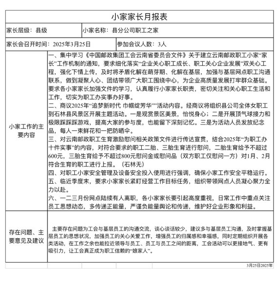 一季度,“基層直通車”還收到234份職工小家“家長”提交的小家“月報”,這些“月報”內容接地氣、有溫度,細致入微地記錄和真實反映了小家當月工作開展情況、工作中存在的不足、基層職工反饋的問題以及下個月的工作安排。這些小家“家長”以認真負責的工作態度和形式多樣的工作方式,確保了上情下達和下情上報對接通暢,發揮了小家“家長”凝心聚情的積極作用,也讓“月報”成為了反映小家真實面貌、促進交流的有效工具。