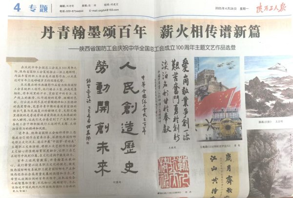 4月28日,在中華全國(guó)總工會(huì)成立100周年之際,《陜西省工人報(bào)》第4版“丹青翰墨頌百年 薪火相傳譜新篇”—陜西省國(guó)防工會(huì)慶祝中華全國(guó)總工會(huì)成立100周年主題文藝作品選登專題中,刊登了西安市分公司工會(huì)選送的職工王曉軍的書法作品。